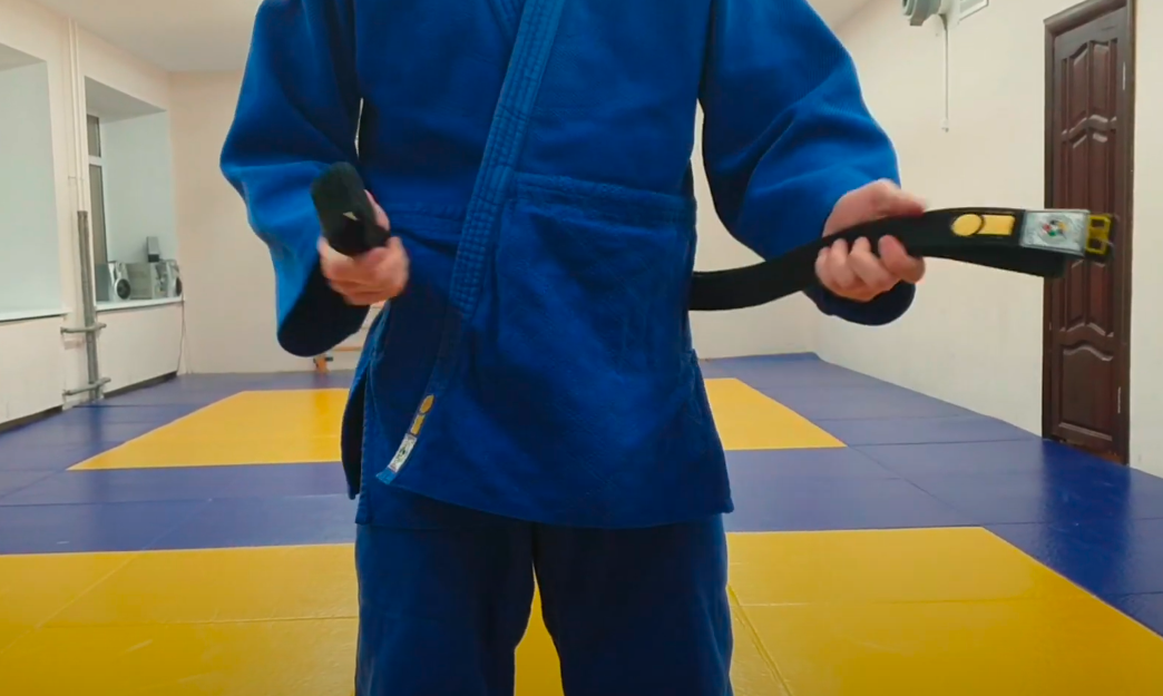 Изначально делаете все тоже самое. Также поправляете дзюдогу и также складываете пояс вдвое, но теперь пояс сразу заводите за спину и выводите оба конца наперед.