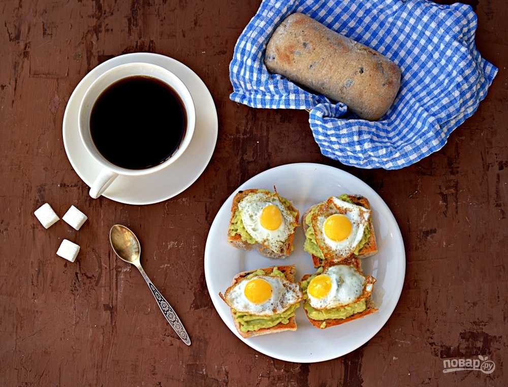 Сковороду смажьте сливочным маслом и обжарьте хлеб. Затем смажьте хлеб размятой мякотью авокадо. Яйца поджарьте до готовности. Выложите яйца на смазанные тосты. Дополнительно блюдо можно украсить завтрак зеленью и молотой паприкой.