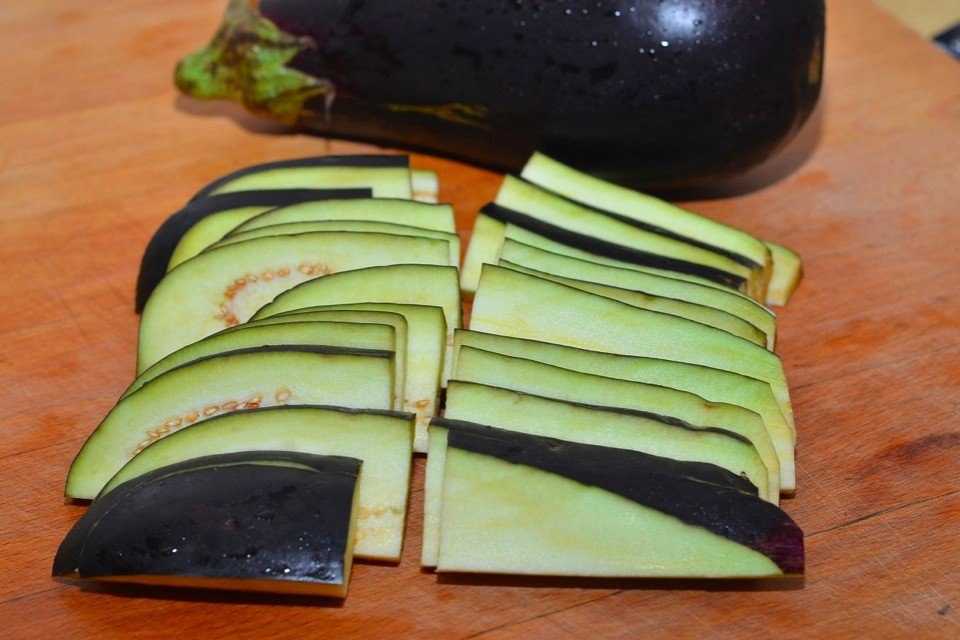 - Спелые сине-фиолетовые овощи среднего размера ополоснуть, срезать плодоножку. Сделать небольшой разрез. В кастрюлю вылить воды, довести до кипения. Выложить обработанный продукт, варить 3-4 минуты. Для устранения горечи рекомендуется немного присолить. Используя шумовку достать, выложив рядами друг на друга в тару. Поверх поставить тарелку или разделочную доску, прижимающую небольшим грузом. Так, вытекает лишняя жидкость.
