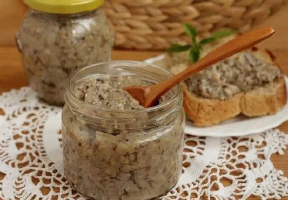 Очищенные грибы, а у них удаляют не только пленчатое кольцо, но и кожицу, укрывающую шляпку, хорошо промывают в нескольких водах, а затем еще под краном. Варить в немного подсоленной воде примерно 20 мин. Хорошо отцеживаем и прокручиваем на мясорубке. Решетку выбираем мелкую. Лук так же нужно измельчить с помощью мясорубки. Тушим его на сковороде с маслом, пока не выпарится жидкость, добавляем прокрученные грибы и тушим под крышкой еще в течение 40 мин. Приправляем сахаром, перцем и раздавленным чесноком, солим по вкусу. Тушим еще четверть часа. Блюдо готово для подачи. Чтобы лакомиться им всю зиму, разложим немедленно после приготовления в стерилизованную посуду, на дно которой положены пряности. Закатанные банки храним на холоде.
