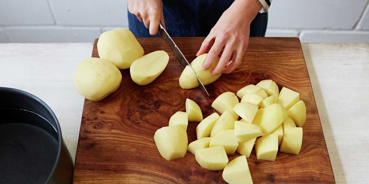 - Далее порежем картофель острым ножом на произвольные не большие кусочки. Так он сварится намного быстрее. Старайтесь, чтобы толщина кусочков была одинаковой, иначе картофель сварится не равномерно.