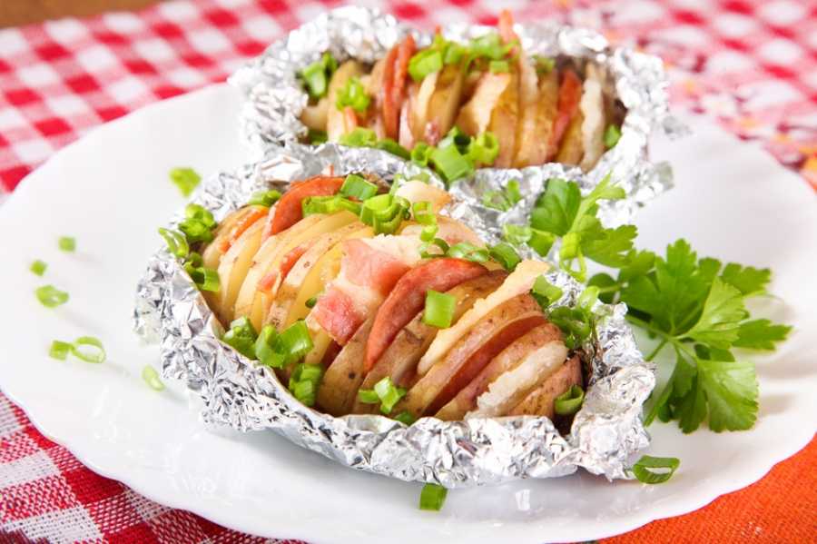Время запекания будет зависеть от размера картофеля. За 10 минут до готовности фольгу нужно снять, чтобы блюдо зарумянилась.