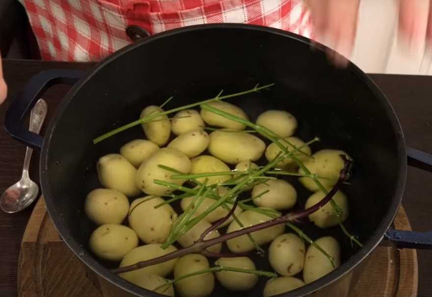 - Отвариваем картошку в подсоленной воде. Вместе с картофелем, для аромата добавить веточки базилика и стебли укропа.