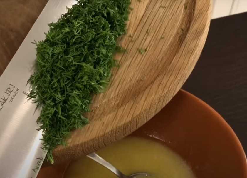 Пока бульба варится — рубим зелень и добавляем её к маслу. Масло имеет смысл оставить недалеко от духовки в керамической миске, чтобы оно растопилось.