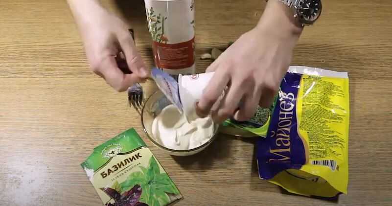 1. Готовку всё же планирую начать с приготовления соуса. Возьмите глубокую, но не большую миску. Поочередно выложите в посуду следующий набор ингредиентов: сметану, майонез, молоко (в том случае если соус получится густым). Заправляем полученную смесь солью и прованскими травами. Для пикантности добавим чеснок, предварительно очистив зубчики от шелухи, а после измельчив с помощью тёрки или ножа.
