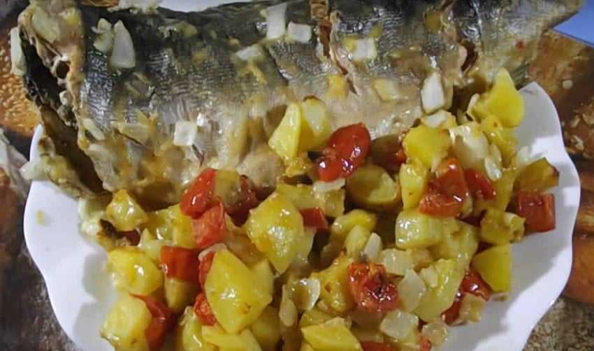 Поверьте, это очень вкусно! С картофелем, луком, помидоркой, ну просто пальчики оближешь. Вкусная, нежная рыба будет готова уже сразу с гарниром, который пропитается ее вкусом и ароматом.