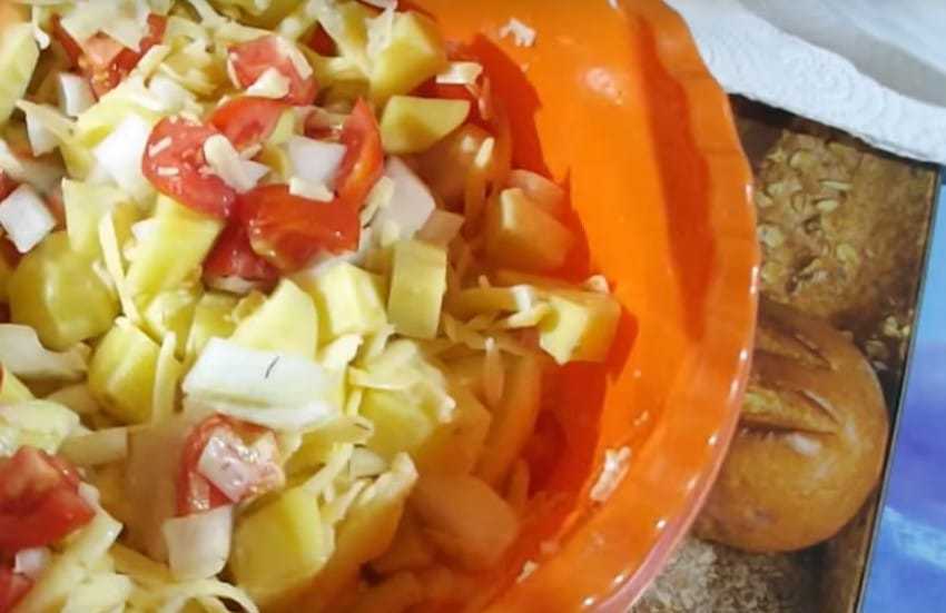 2. Помидоры измельчите кубиками и добавьте в миску к овощам. Сыр натрите на крупной тёрке и смешайте с овощами. Посолите, всыпьте специи и перемешайте.
