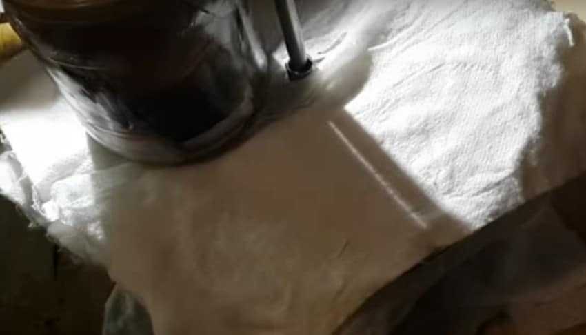 - На поверхность противня нужно поместить ткань, предварительно смоченную чистой водой. Банку необходимо поместить на ткань.