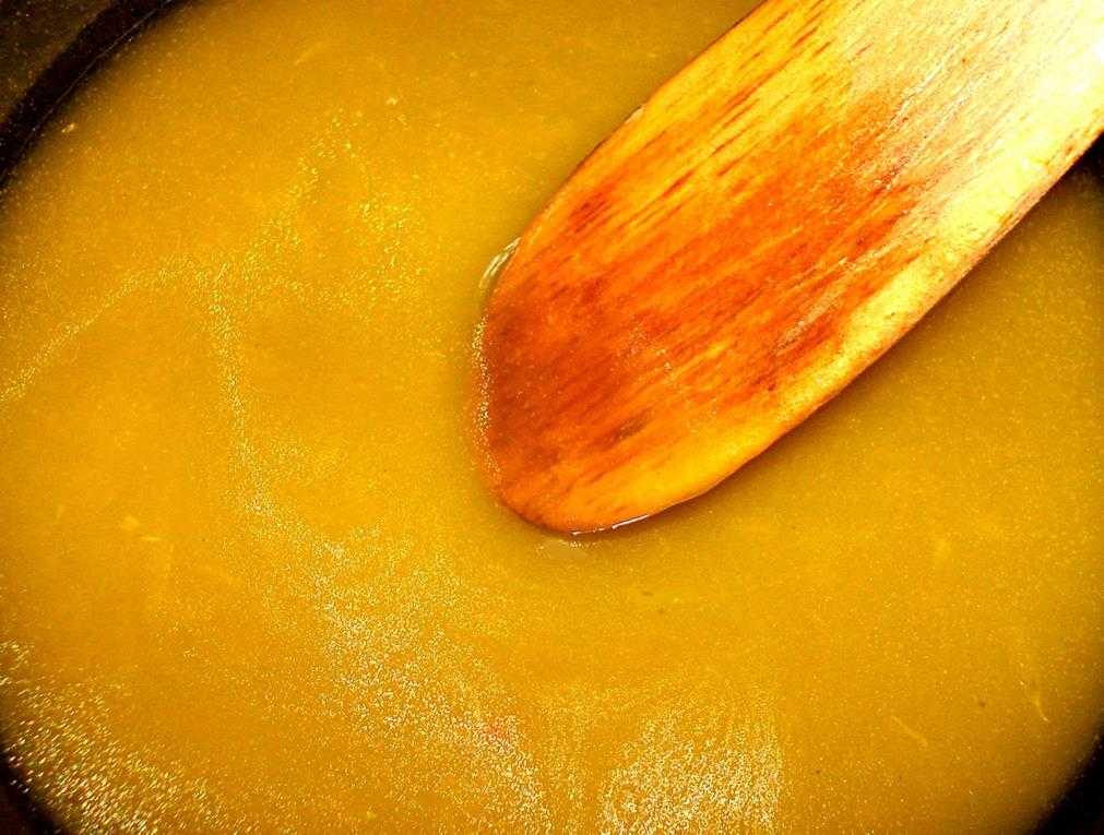 - Смешать соевый соус, мед, сок и мякоть оставшейся части фрукта. Нагреть смесь и кипятить 5 – 6 минут. За это время мед должен полностью раствориться.