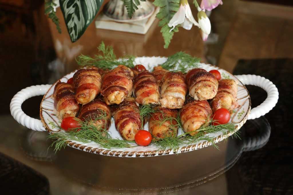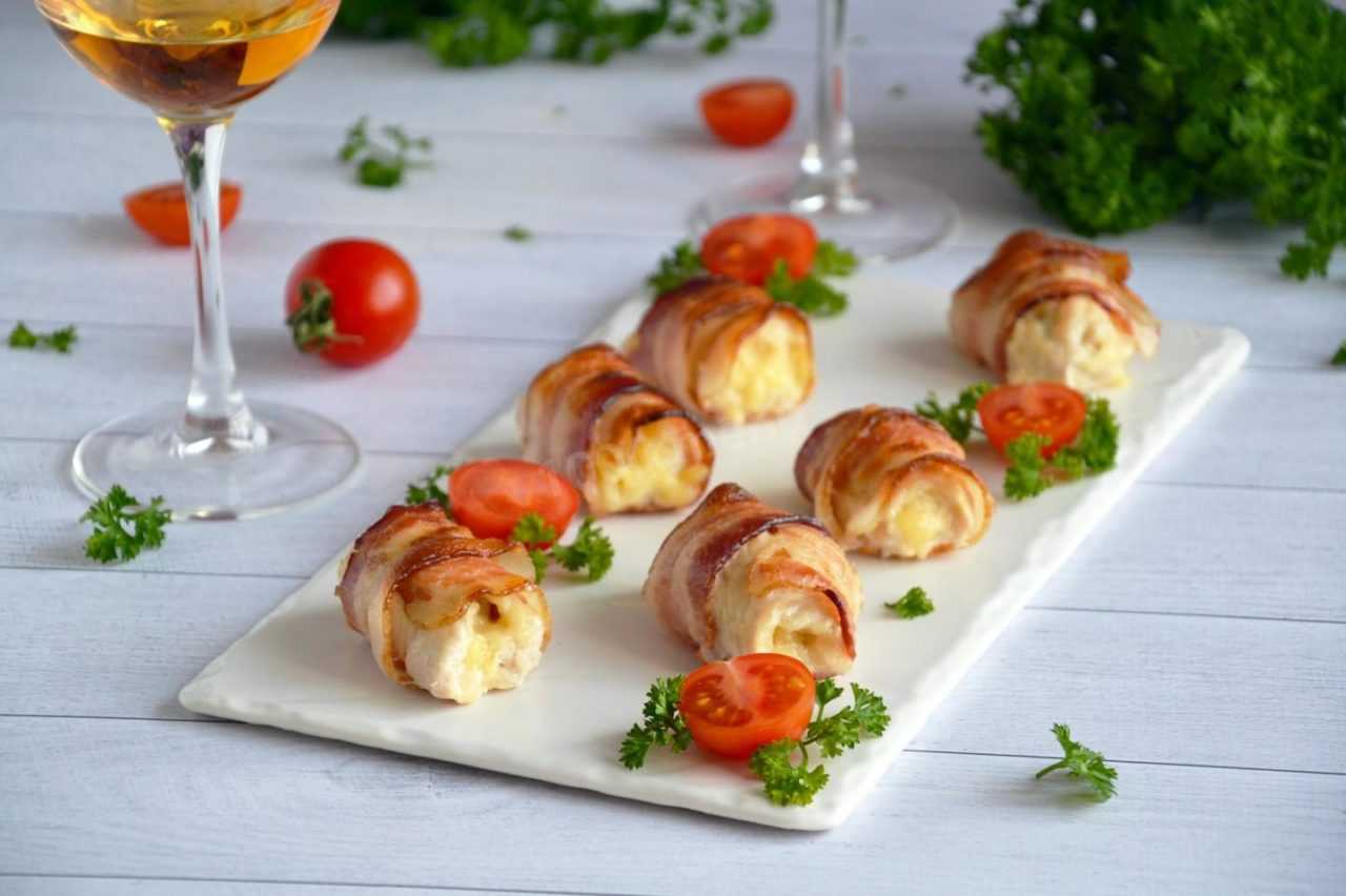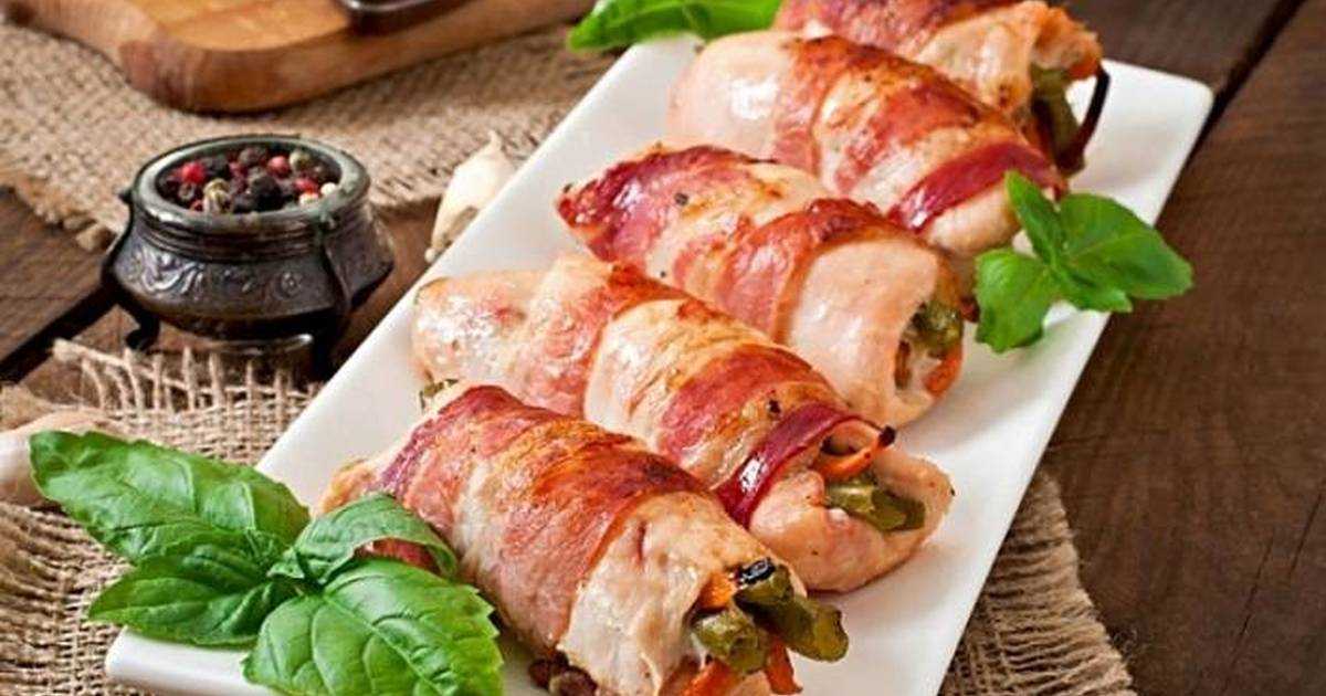 Одним из видов питательных низкокалорийных блюд являются куриные рулетики в беконе. Это удачное сочетание не ярко выраженного вкуса мяса птицы и сочности, которая достигается благодаря обжарке в тонких слайсах бекона, превратившегося в итоге в хрустящую ароматную корочку.