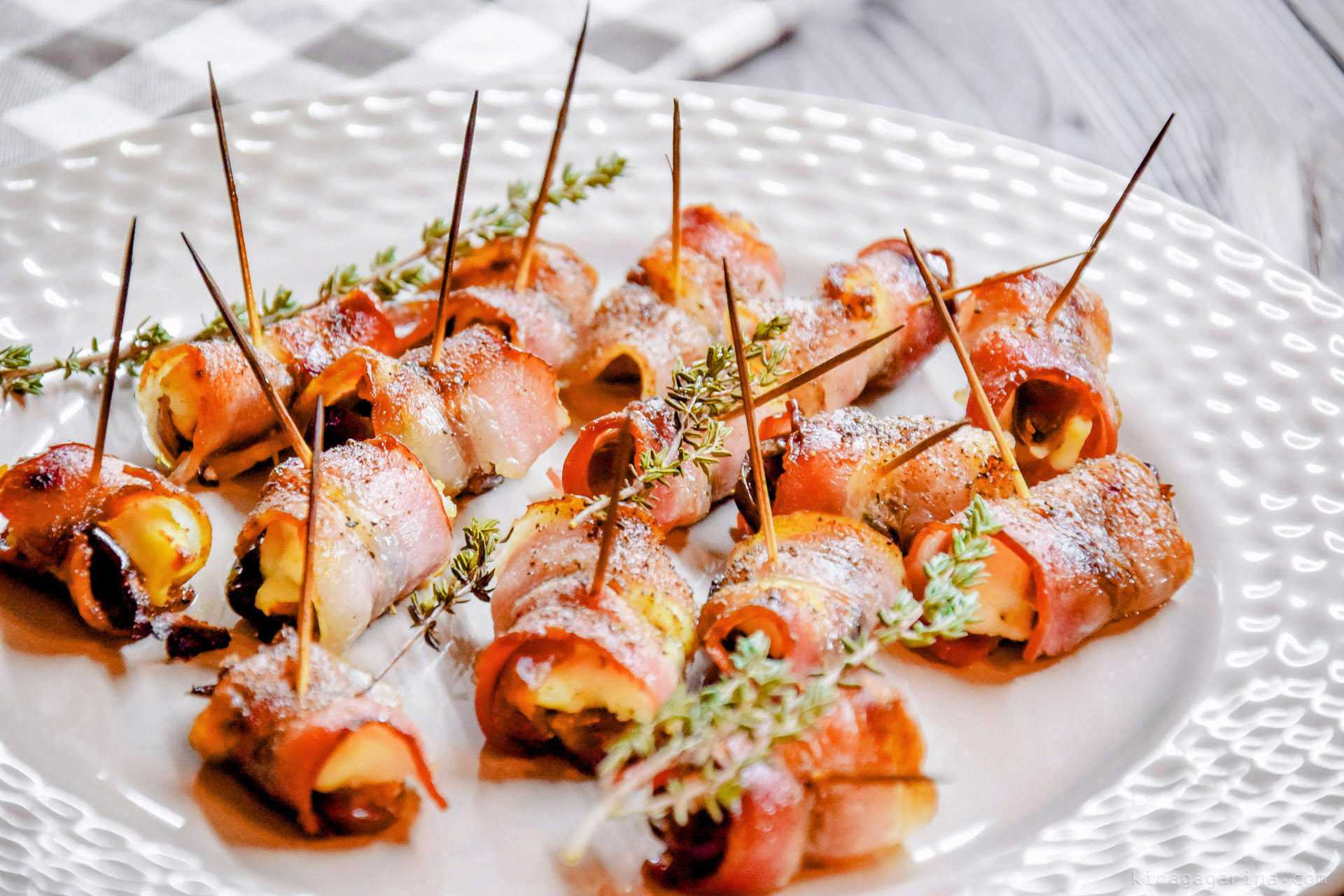 - Каждый рулетик аккуратно обернуть ломтиком бекона, если требуется, то не одним;
