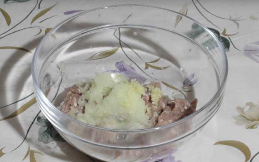 - В куриный фарш добавить куриное яйцо, репчатый лук, сухари. Тщательно вымесить фарш.