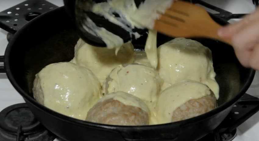Сливки соединяются с тёртым сыром, измельчённым чесноком и зеленью. Чаша мультиварке смазывается кусочком масла, и туда выкладываются сформированный мясной продукт. Следом добавляется соус, и блюдо готовится в режиме «тушение» около 45 минут.