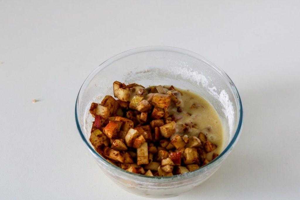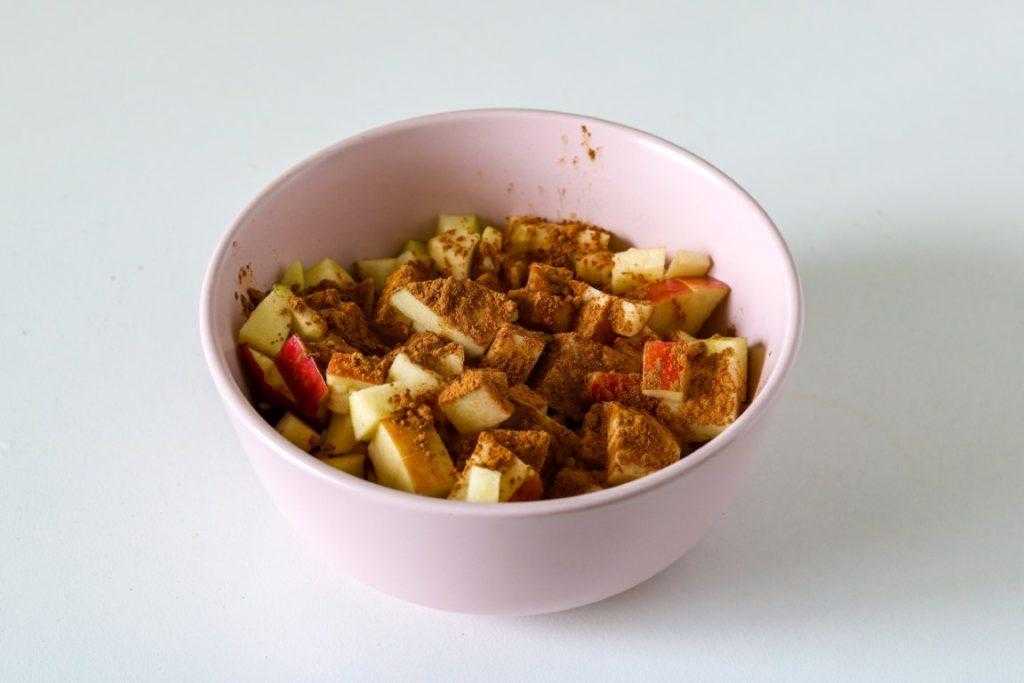 3. Добавьте корицу к яблочным кубикам, перемешайте, чтобы кусочки фруктов полностью покрылись специей. При желании можете добавить кардамон, молотую гвоздику или мускатный орех.