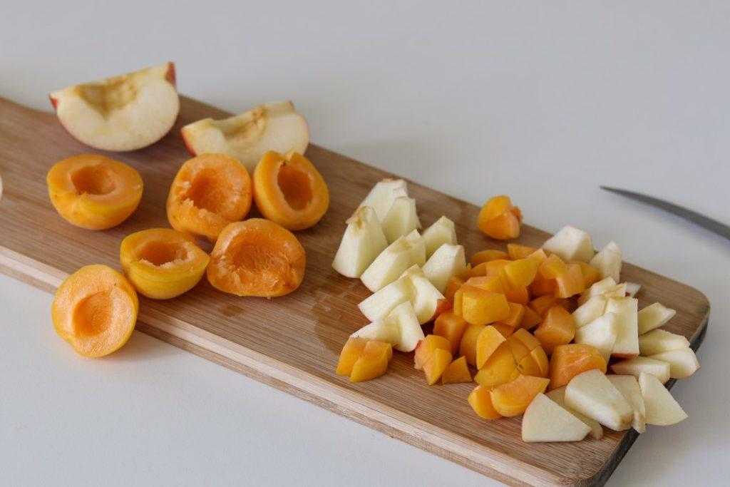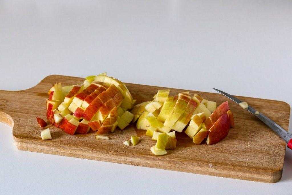 3. Яблоки очистите от кожуры, удалите сердцевину с семечками, мякоть нарежьте тонкими дольками.