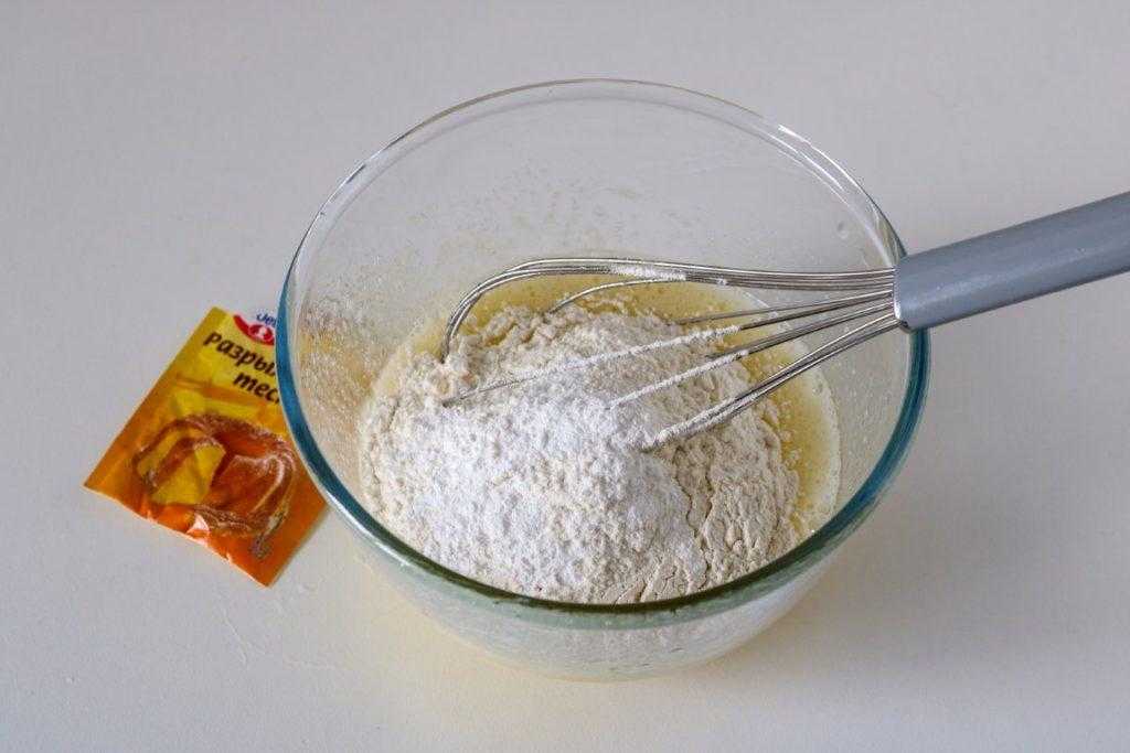 6. Просейте в чашу муку и разрыхлитель, перемешайте. Тесто должно получиться гладким и достаточно жидким. Это нужно, чтобы оно лучше пропеклось в микроволновке.