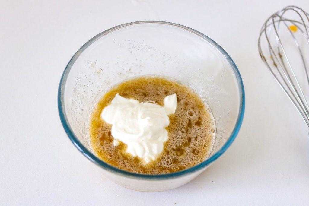 3. Замесите тесто. В миске смешайте растопленное сливочное масло, 2 желтка, сметану, 4 столовые ложки сахара и разрыхлитель для теста.