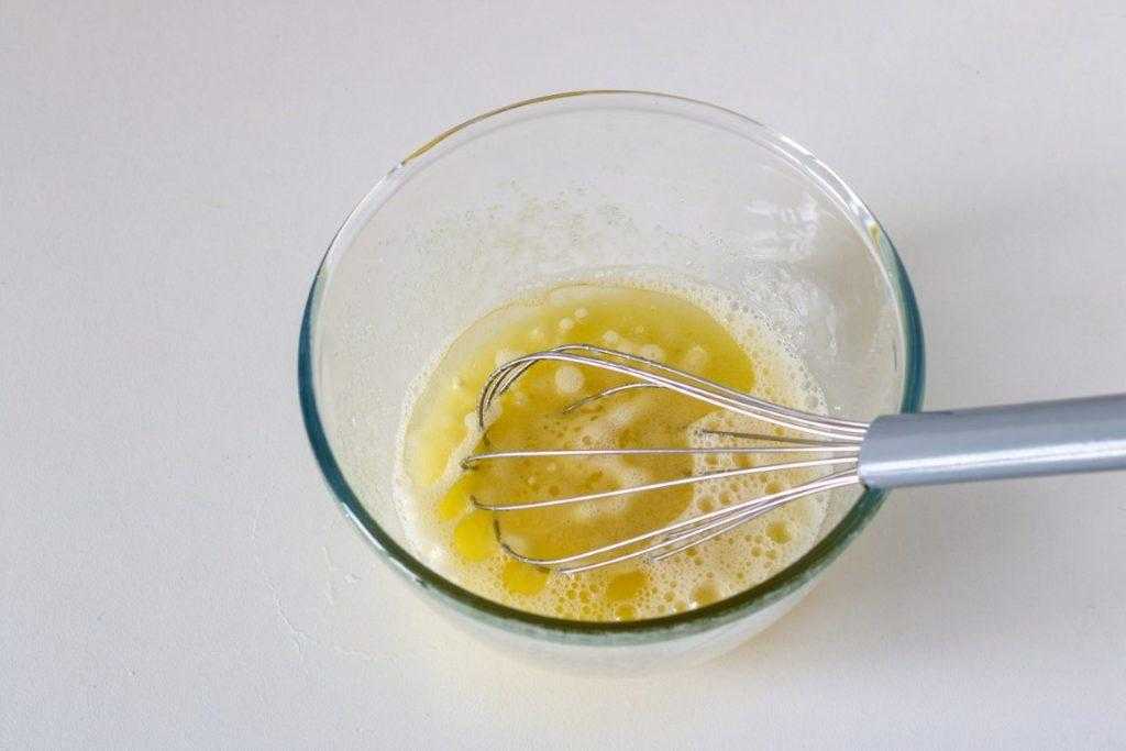 5. Растопите в микроволновке сливочное масло, дайте ему немного остыть и долейте к яйцам. Перемешайте.