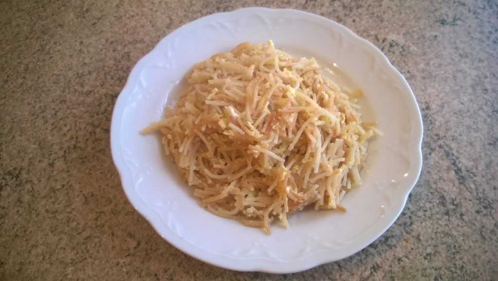 - Вермишель отправить в сковородку, всё хорошо размешать. Вылить яичный состав.