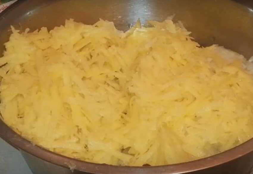 - Картошку и лук мелко натереть, смешать. Дать массе немного постоять, а затем слить выделившийся сок.