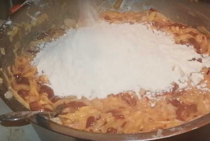 - После тщательного перемешивания 2 первых продуктов можно начинать всыпать в массу муку. Лучше всего делать это небольшими порциями, добиваясь однородности после каждой новой.