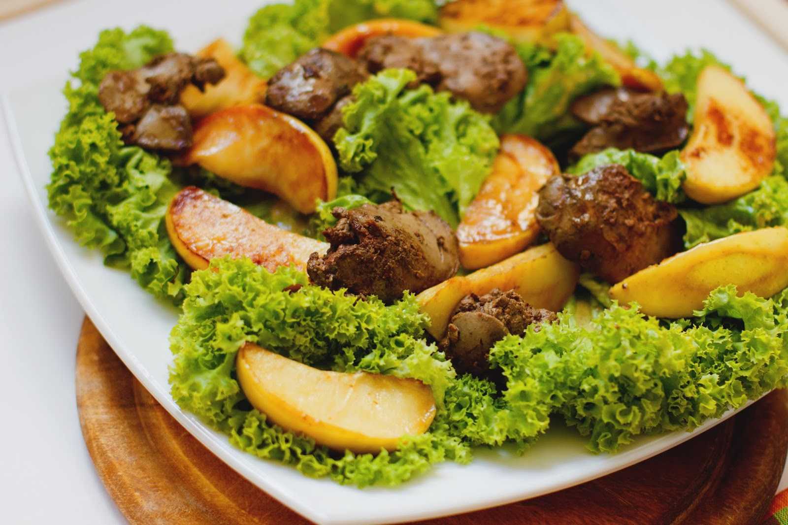 Теплый салат с куриной печенью и манго