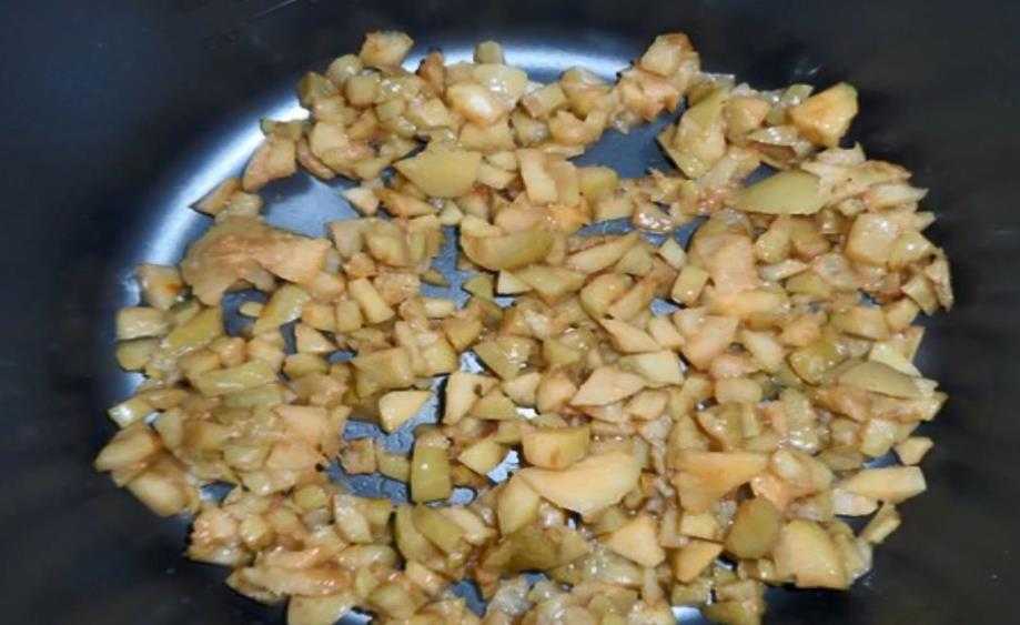 - Выкладываем на сковородку 50 грамм сливочного масла 82 % жирности и высыпаем яблоки. Обжариваем в течение 5 минут, таким образом мы карамелизуем их.