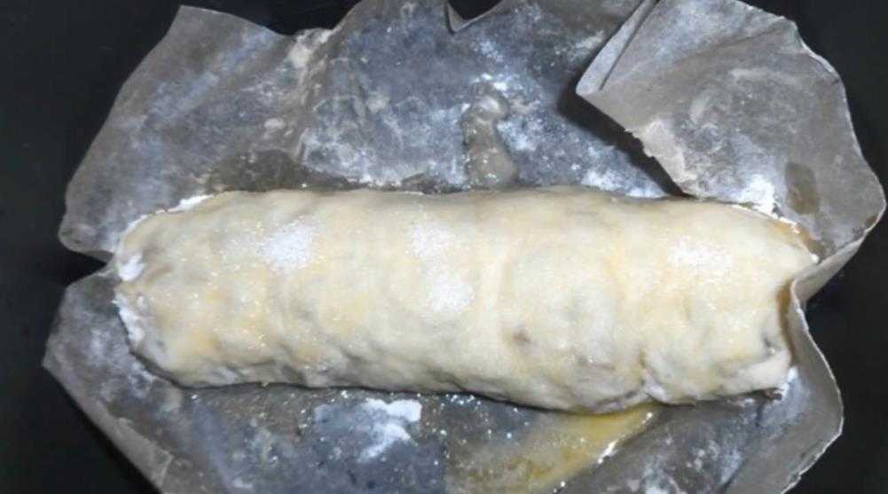 Притрусить оставшимся сахаром и завернуть в виде рулета, тщательно защипывая края. Чашу мультиварки выстелить пергаментом, положить в нее кулинарное изделие, полить его растопленным маслом. Выставить режим «Выпечка» на 90 минут, готовить под крышкой до звукового сигнала.