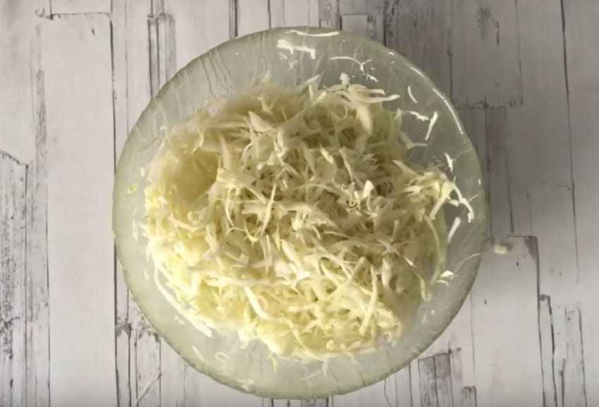 1. Нашинкуйте овощ мелкой соломкой, посолите (примерно 0,5 ч.л). Хорошенько помните руками, чтобы она дала сок.