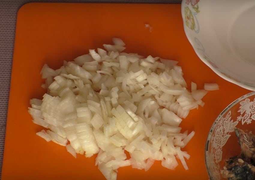 - Лук измельчить кубиками, грибы дольками. Раскалить масло в сковороде и поджарить лук пару минут. Присоединить грибы и жарить, пока жидкость из грибов не испарится.