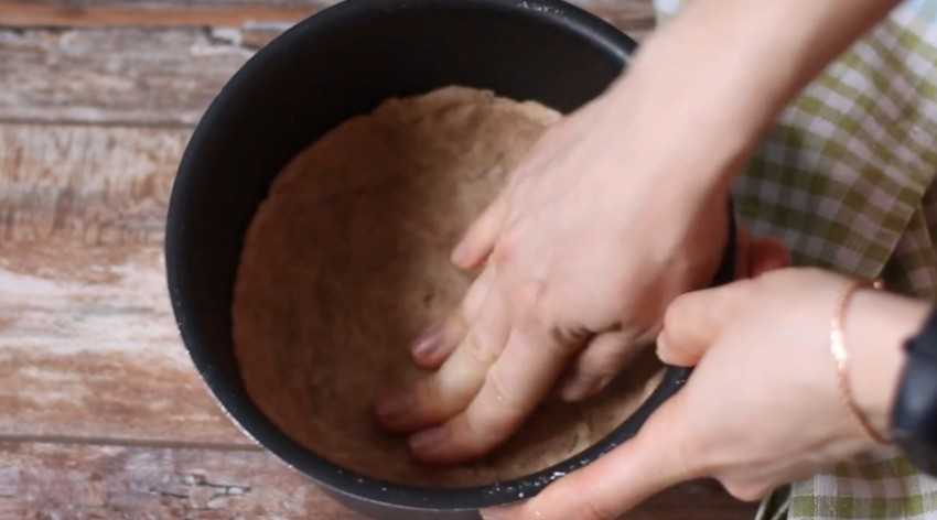 2. Разровняйте тесто по дну формы, оставив небольшие бортики, чтобы не вытекла заливка.