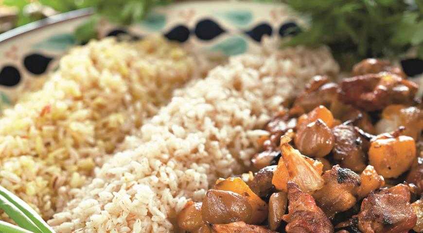Шаг 11Шафран растворить в 1 ст. л. кипяченой воды. Смешать с 1 ст. л. сливочного масла. Готовый рис выложить из кастрюли и разделить на 2 части (тесто удалить). В половину риса влить шафрановую смесь и перемешать. На большое блюдо выложить полоской белый рис, рядом – шафранный рис. По центру или сбоку положить баранину. Сразу подать к столу. Хозяйке на заметку