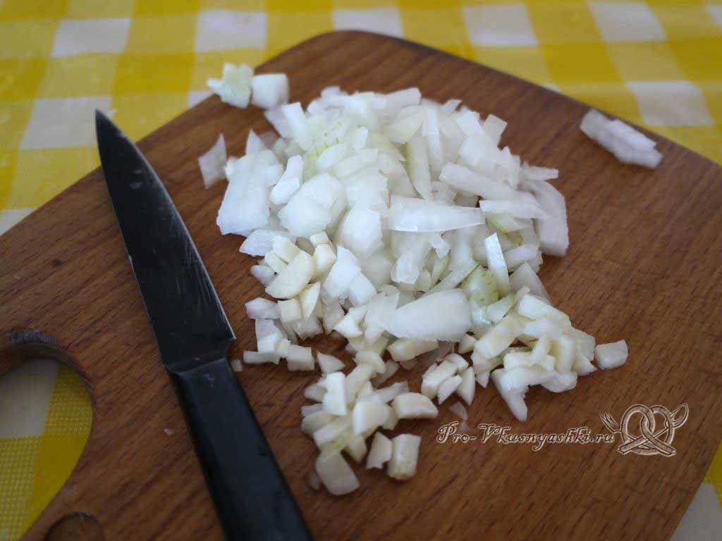 - Головку репчатого лука очистим от шелухи и порубим мелко ножом.