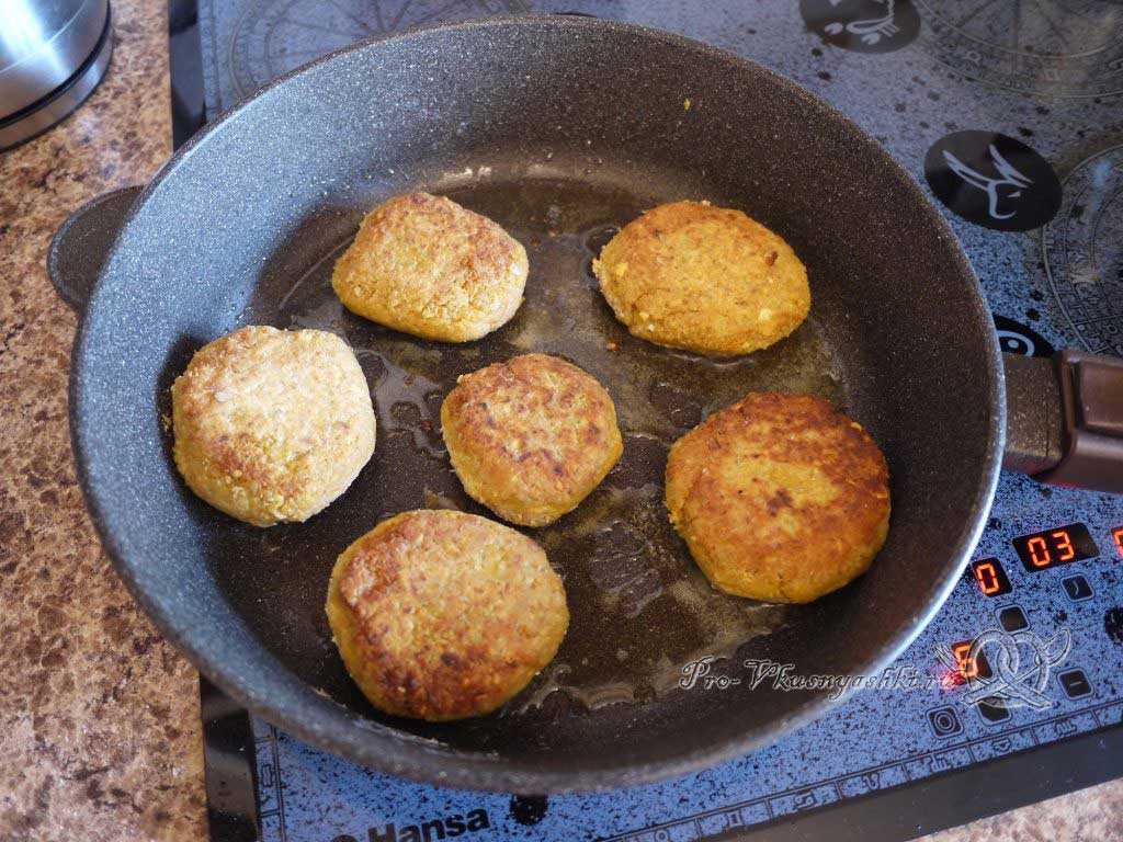 - Обжаривают нутовые котлеты на раскаленной сковороде в достаточном количестве масла. Изделия из сырого бараньего гороха жарят по 5-7 минут с каждой стороны, но переворачивая их через каждые 2-3 минуты, чтобы они не подгорели. Котлеты из вареного турецкого гороха достаточно подрумянить с обеих сторон до образования аппетитной корочки.