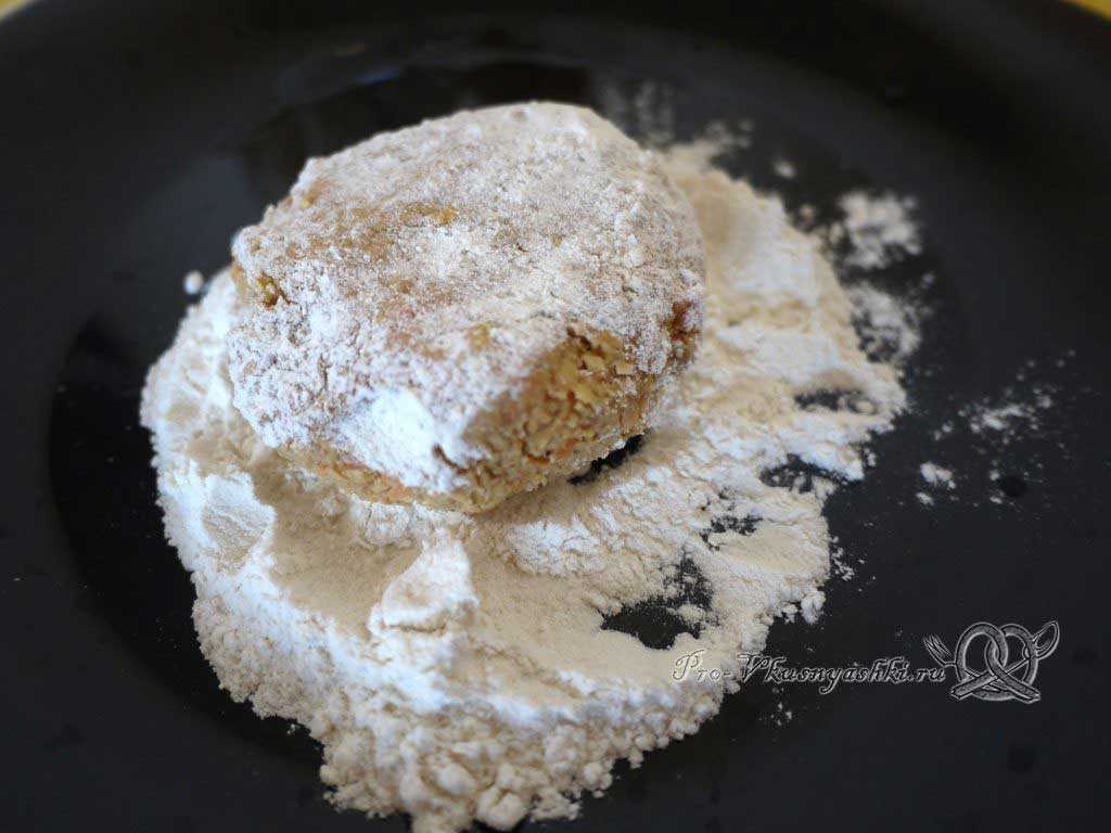 - Сформируйте плоские котлеты и обваляйте их в панировке из сухарей.
