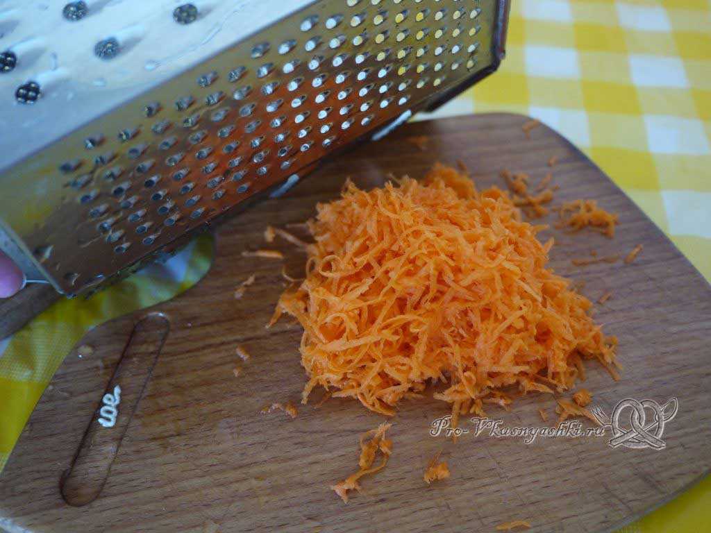 Параллельно с отвариванием нута готовим овощную составляющую наших котлет. Очищаем морковь. Измельчаем её с помощью терки – крупной или мелкой значения не имеет.