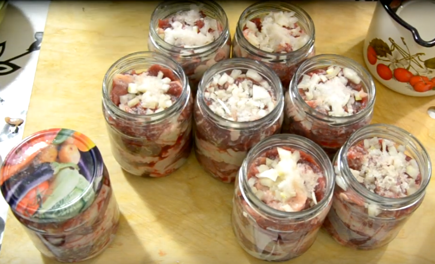 Чтобы тушенка получилась более ароматной, сочной и вкусной, не нужно срезать с мяса жировые прослойки. Еще один важный момент хозяйкам на заметку: продукт перед закладкой в стеклянную тару должен быть комнатной температуры, иначе могут вздуться крышки.