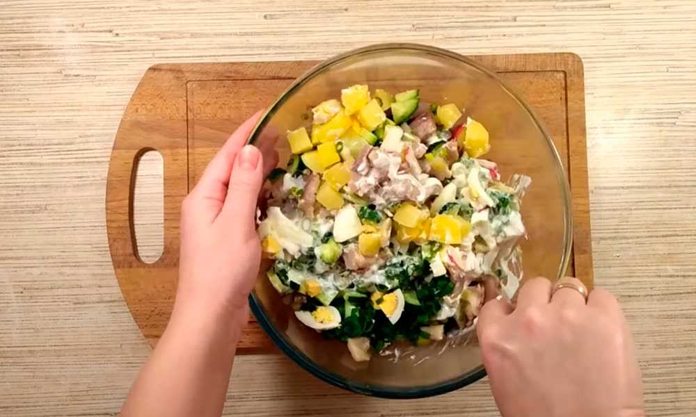 • Смешать продукты. Подсолить. Залить майонезом. Перемешать.