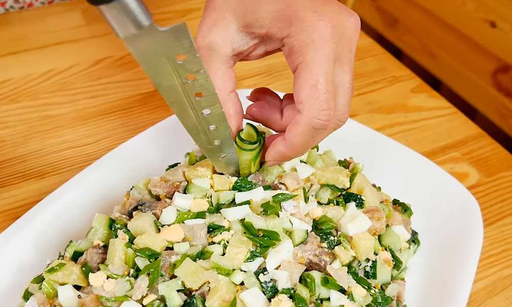 - Пятый – порезанные огурцы, с которых слили сок. Этот компонент вариативен. Салат из скумбрии консервированной с огурцом более сочен и интересен, чем классические варианты.
