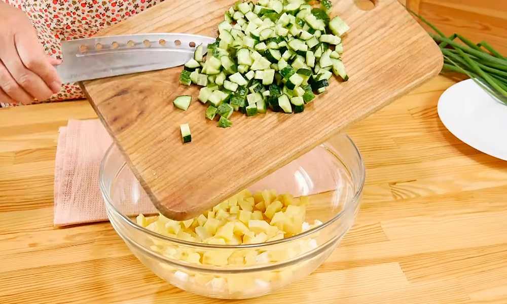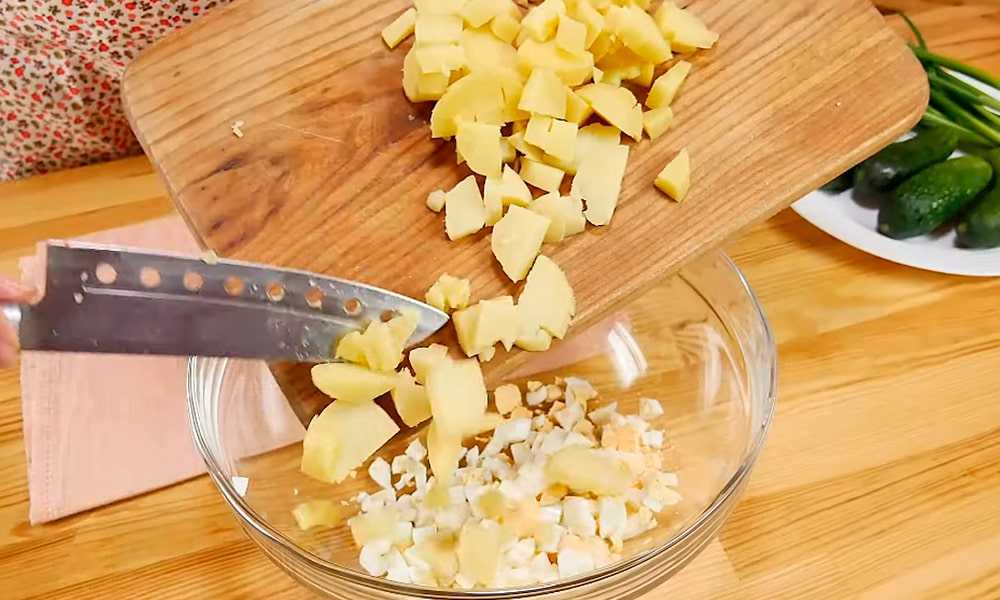 - Очищаем от кожуры сваренные овощи. Рубим их небольшими кусочками. Аналогично рубим яйца. Свежие или соленые огурцы очищаем от кожицы и нарезаем мелко.