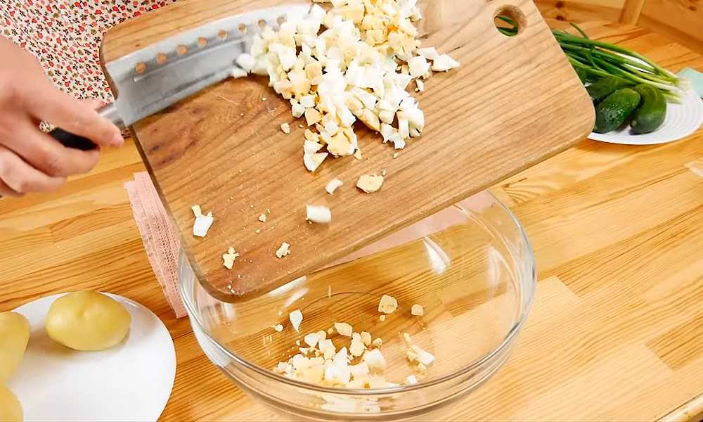 - Яйца охлаждаются, с них убирается скорлупа. После их нужно нарезать кубиками;