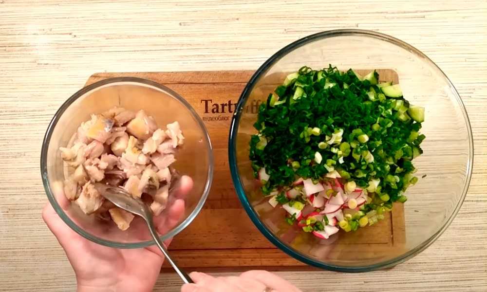 8. Если вы не любите жирные блюда, то перед тем как добавить рыбу в салат, следует слить маринад с консервы.