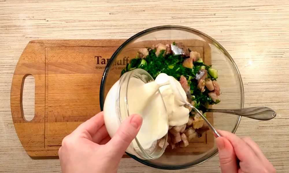 - Все компоненты выкладываются в чашку, добавляется майонез;