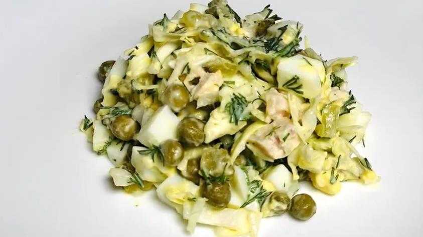 - Яйца избавить от скорлупы, нашинковать маленькими ломтиками. Смешать с остальными компонентами горошек без маринада, посыпать перцем и полить соусом.