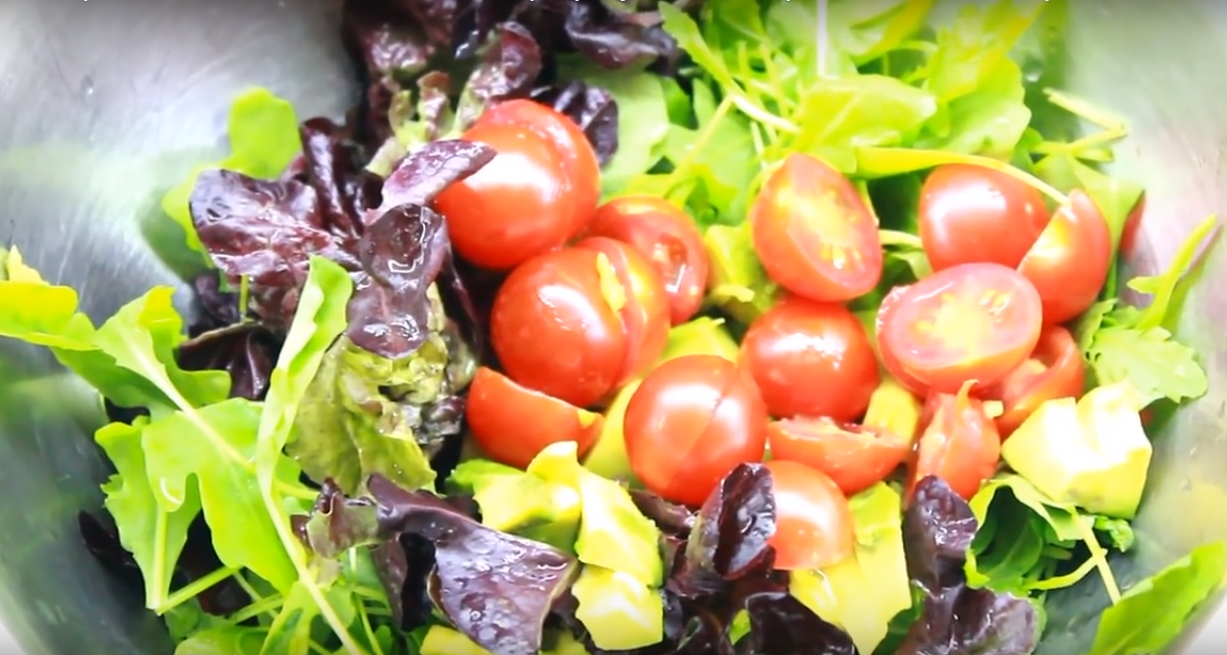 14. Формируем наш салат. Выкладываем рукколу, дубок, помидоры, остывшие креветки, авокадо.