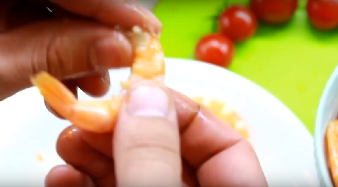2. Очищаем наши креветки. Убираем голову, снимаем панцырь.