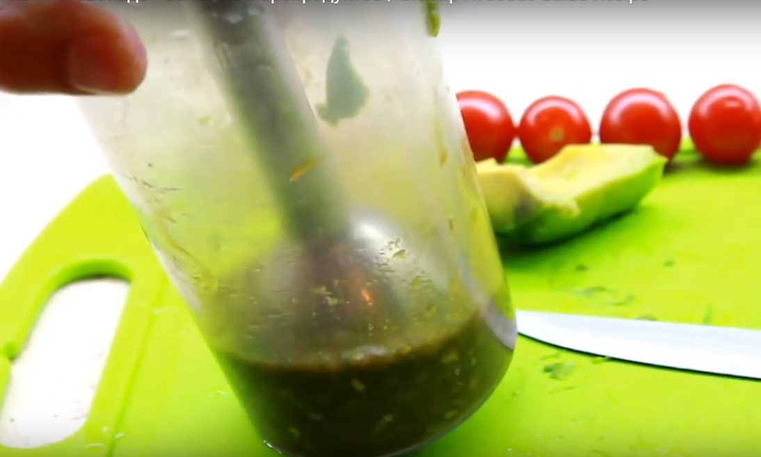 5. Из сока лимона и грейпфрута с оливковым маслом и специями взбалтываем соус для заправки нашего блюда.
