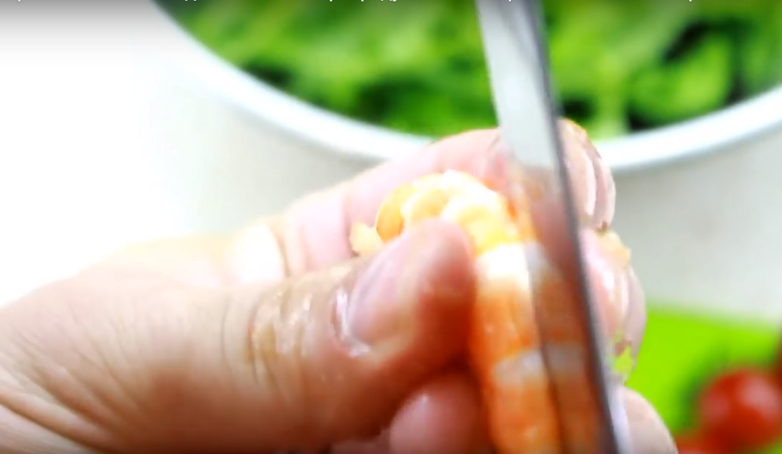 5. У крупных и средних креветок – убираем кишечник. Для этого разрезаем креветку ножом, как показано на фото.