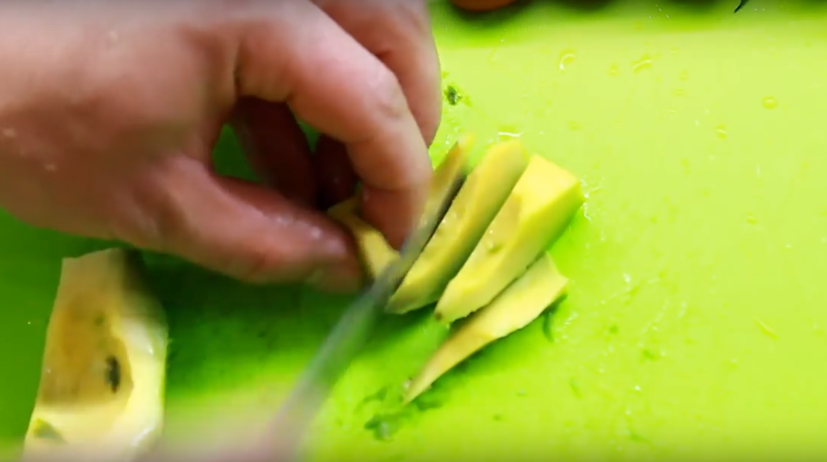 3. Очищаем авокадо чистим и нарезаем его «полумесяцем».