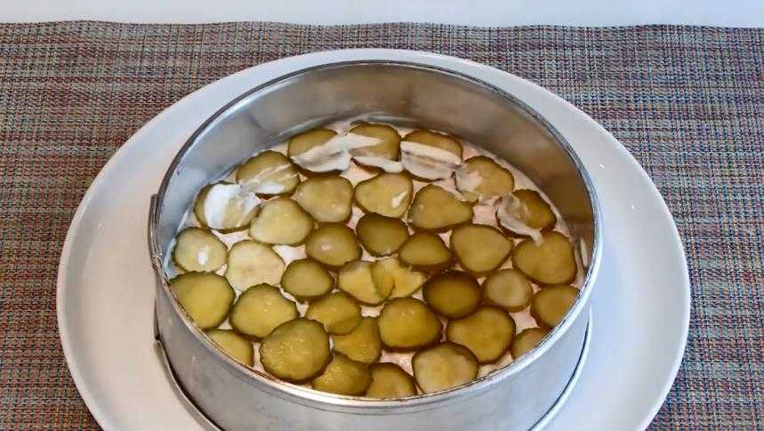 8.Третий слой — куриные кусочки, которые сверху промазываются майонезом.